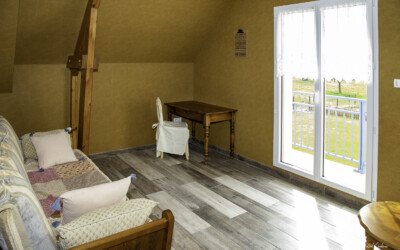 Coin salon donnant sur un balcon permettant d‘apprécier la vue sur le jardin à l‘arrière et sur les champs avoisinants.