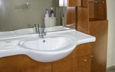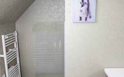 Salle de bain privative attenant avec douche italienne, meuble SDB avec vasque et meuble d‘appoint, WC et sèche serviette